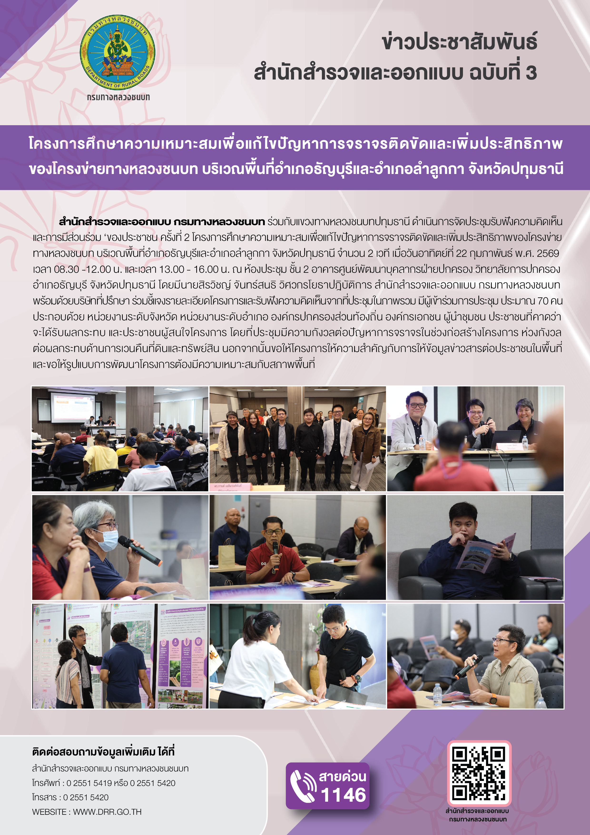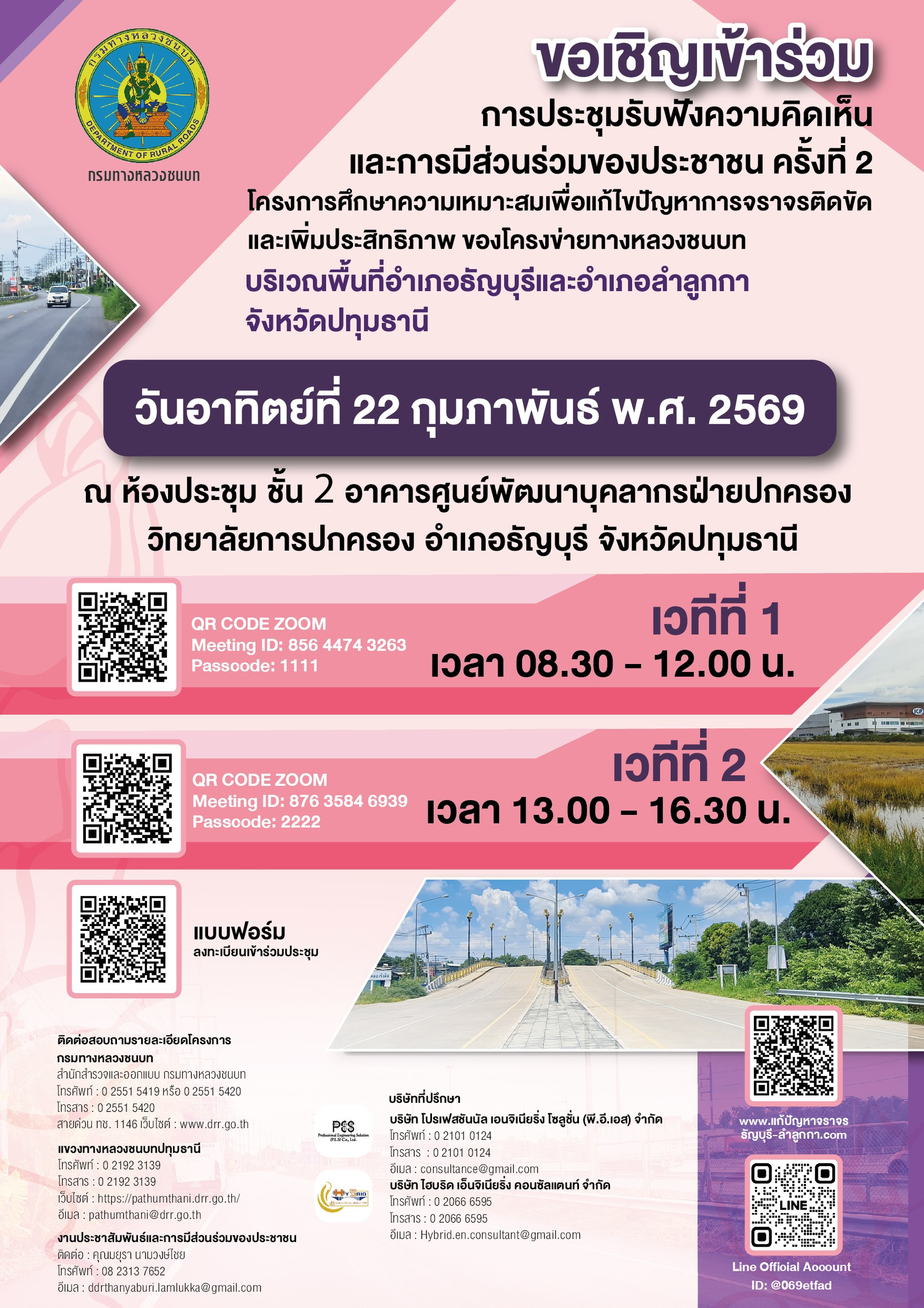 สำนักสำรวจและออกแบบ ร่วมกับแขวงทางหลวงชนบทปทุมธานี ดำเนินการจัดประชุมรับฟังความคิดเห็นและการมีส่วนร่วมของประชาชน ครั้งที่ 2 โครงการศึกษาความเหมาะสมเพื่อแก้ไขปัญหาการจราจรติดขัดและเพิ่มประสิทธิภาพของโครงข่ายทางหลวงชนบท บริเวณพื้นที่อำเภอธัญบุรีและอำเภอลำลูกกา จังหวัดปทุมธานี จำนวน 2 เวที เมื่อวันอาทิตย์ที่ 22 กุมภาพันธ์ พ.ศ. 2569 เวลา 08.30 -12.00 น. และเวลา 13.00 - 16.00 น. ณ ห้องประชุม ชั้น