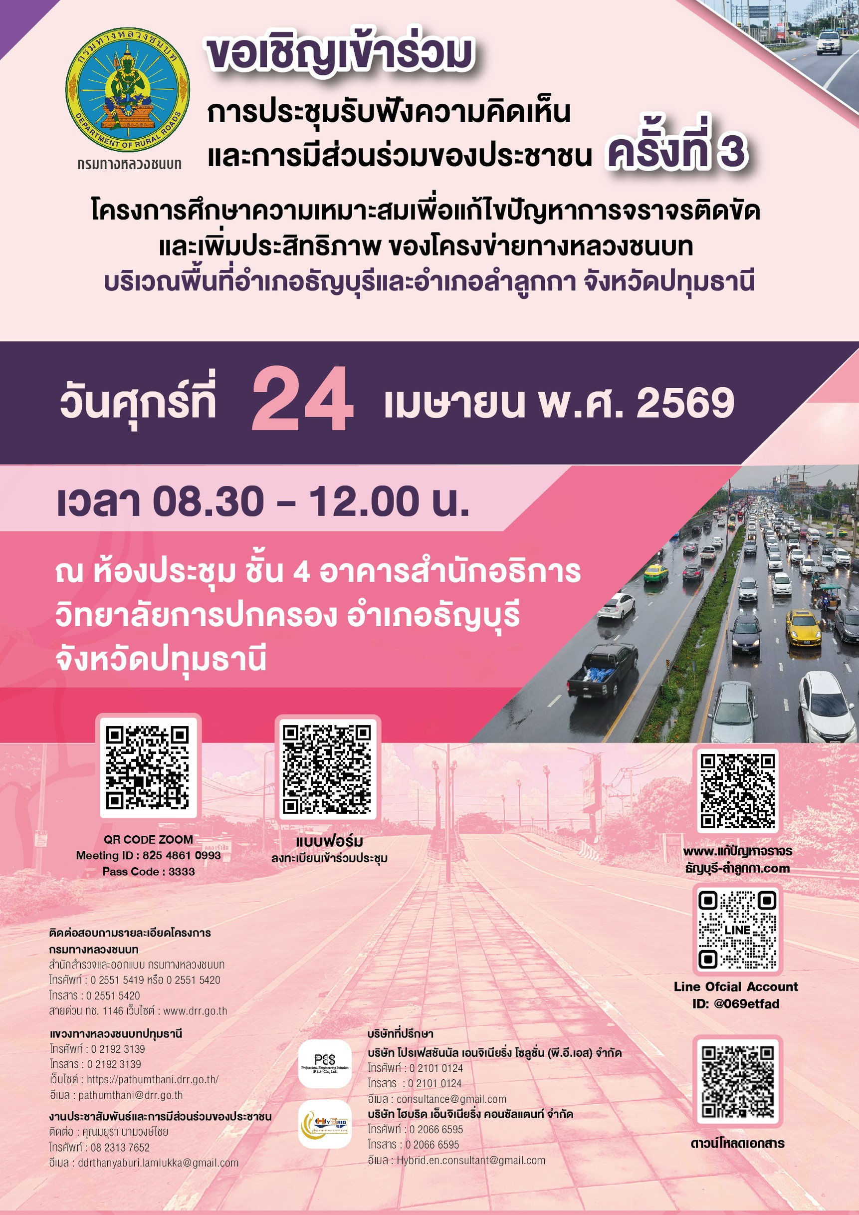 สำนักสำรวจและออกแบบ ร่วมกับแขวงทางหลวงชนบทปทุมธานี ดำเนินการจัดประชุมรับฟังความคิดเห็นและการมีส่วนร่วมของประชาชน ครั้งที่ 2 โครงการศึกษาความเหมาะสมเพื่อแก้ไขปัญหาการจราจรติดขัดและเพิ่มประสิทธิภาพของโครงข่ายทางหลวงชนบท บริเวณพื้นที่อำเภอธัญบุรีและอำเภอลำลูกกา จังหวัดปทุมธานี จำนวน 2 เวที เมื่อวันอาทิตย์ที่ 22 กุมภาพันธ์ พ.ศ. 2569 เวลา 08.30 -12.00 น. และเวลา 13.00 - 16.00 น. ณ ห้องประชุม ชั้น