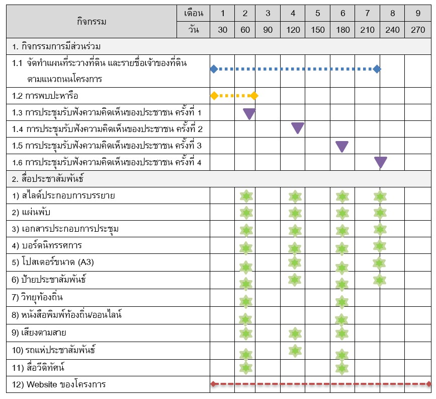ในการจัดประชุมแต่ละครั้ง ผู้แทนกลุ่มบริษัทที่ปรึกษาจะเข้าดำเนินการเผยแพร่ข้อมูลข่าวสารโครงการแก่หน่วยงานภาครัฐ ภาคเอกชน และประชาชนที่เกี่ยวข้อง เพื่อให้ทุกฝ่ายได้รับทราบข้อมูลข่าวสารโครงการฯ อย่างทั่วถึงตลอดระยะเวลาดำเนินโครงการ กรอบระยะเวลาเบื้องต้นของแผนการดำเนินงานด้านการมีส่วนร่วมของประชาชน ดังแสดงในตาราง